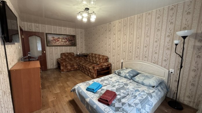 Однокомнатная квартира с комфортной двуспальной кроватью с ортопедическим матрасом и уютным диваном-кроватью.