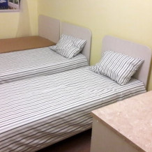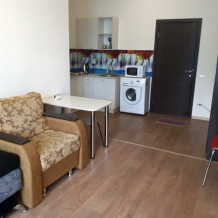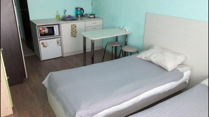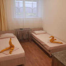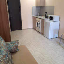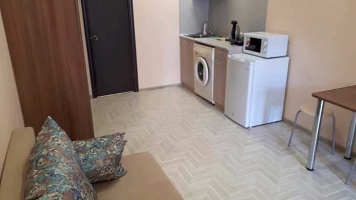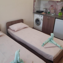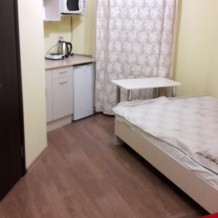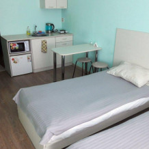 Расположен в двухэтажном здании и включает в себя студии различной категории от эконома до люкса. Мы находимся в жилом районе, и номера - это студии квартирного типа со всем необходимым для проживания (кухня, спальня). В каждом номере доступ к сети интернет Wi-Fi. Еженедельная уборка с заменой постельного входит в стоимость. Все номера оборудованы кухней со всей техникой и посудой (СВЧ печь, чайник, плитка, холодильник). В полулюксах и выше есть стиральная машина автомат.
