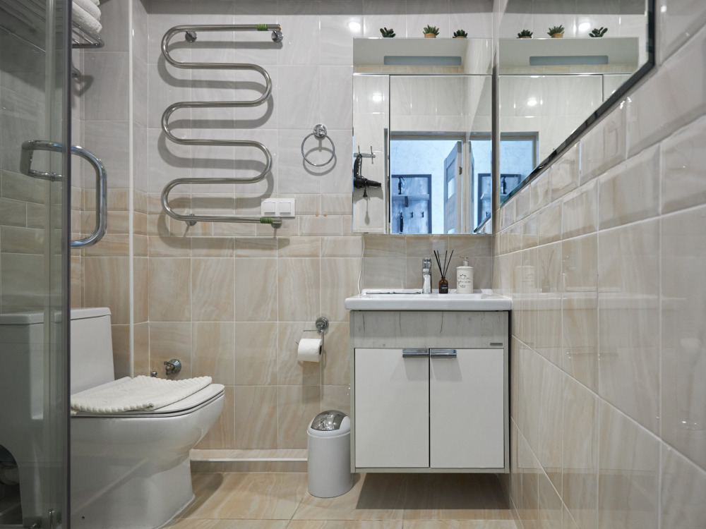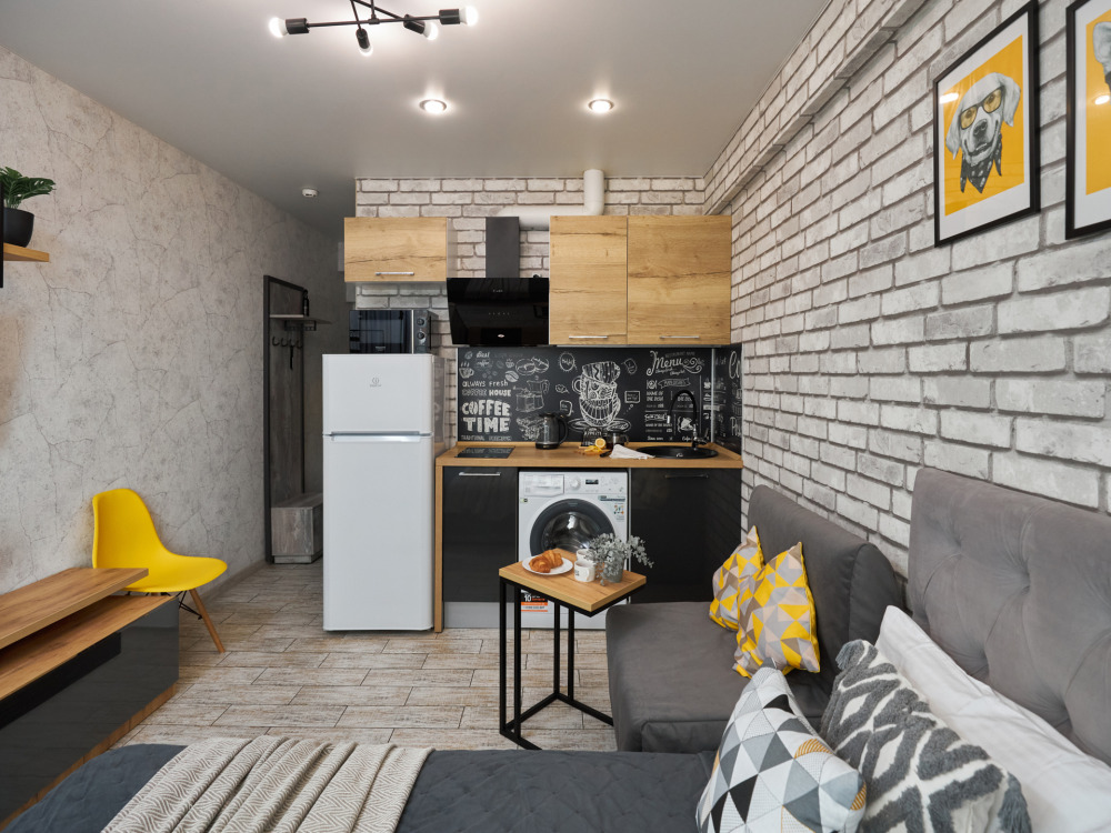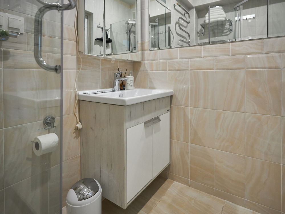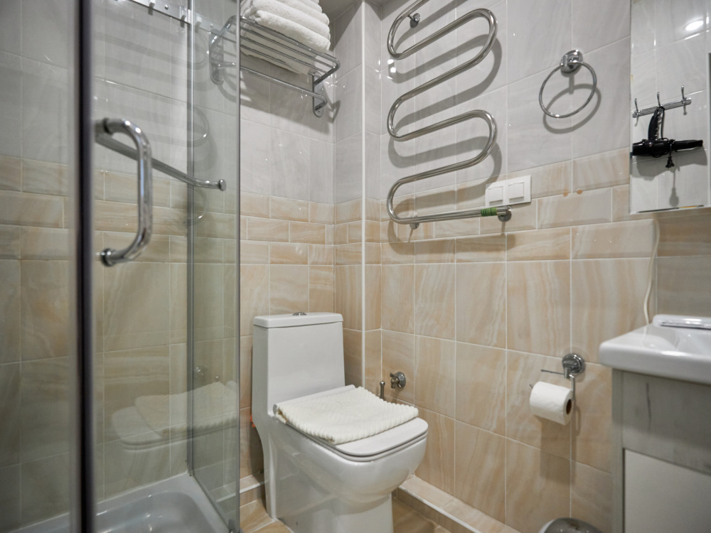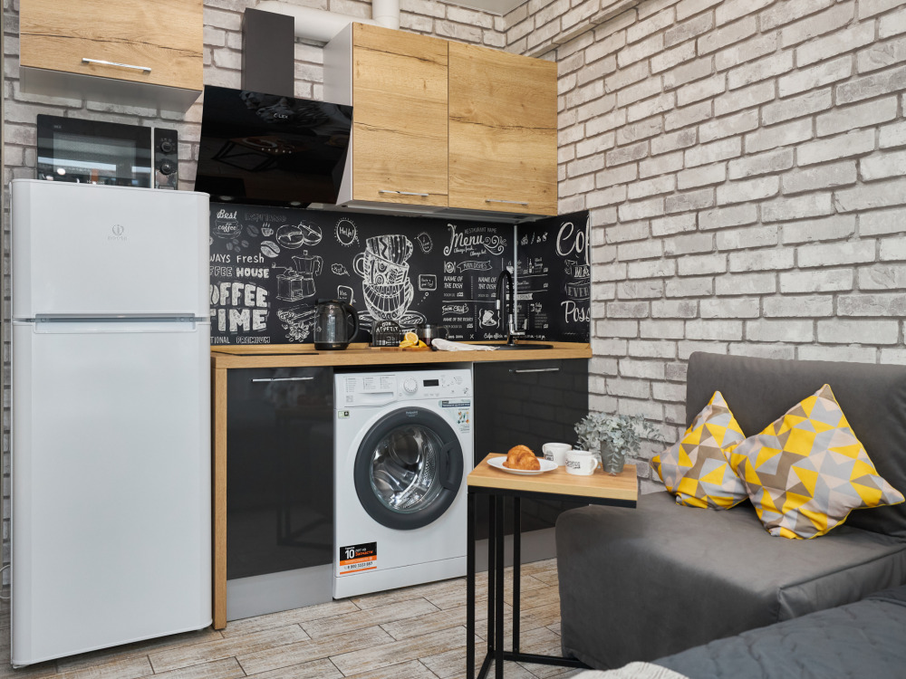 Имеется кухонная зона со всеми принадлежностями. Чайник, микроволновая печь, холодильник, посуда и варочная поверхность для самостоятельного приготовления еды. Санузел оснащен раковиной с зеркалом, душевой кабиной, стиральной машиной, полотенцесушителем и унитазом.