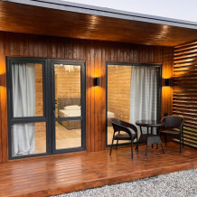 Домики абсолютно новые, расположены в центре города, до моря 5 минут ходьбы. Для заселения предлагаются три 2-местных модульных домика с возможностью размещения до 4-х человек. В домиках имеется: двуспальная кровать, диван раскладной, санузел и душ в номере (совмещены), Wi-Fi интернет, кондиционер, мини-бар, телевизор, электрочайник, фен, терраса.