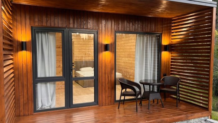 В домиках имеется: двуспальная кровать, диван раскладной, санузел и душ в номере (совмещены), Wi-Fi интернет, кондиционер, мини-бар, телевизор, электрочайник, фен, терраса.