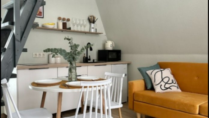 На первом этаже, просторная гостиная с диваном, телевизором, камином, кухонная зона оборудована современным кухонным гарнитуром и обеденным столом. В кухне есть: плита, холодильник с морозильником, посудомоечная машина, микроволновка, чайник, кофемашина. Так же на первом этаже есть санузел и современная ванная комната с душевой кабиной и баней на дровах. Спальня с двумя уютными односпальными кроватями. На втором этаже расположена вторая спальня с роскошной двуспальной кроватью.