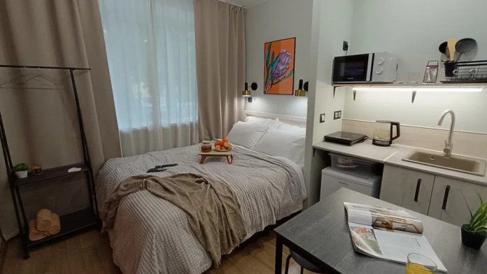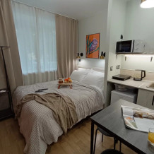 Уютная квартира-студия со свежим дизайнерским ремонтом возле ж/д вокзала.