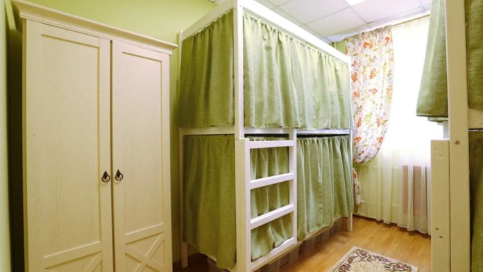 Уютный светлый шестиместный номер. В комнате 3 двухъярусные кровати со шторками и стойка для вешалок. Общий санузел. Вид из окна на тихий дворик.
