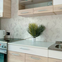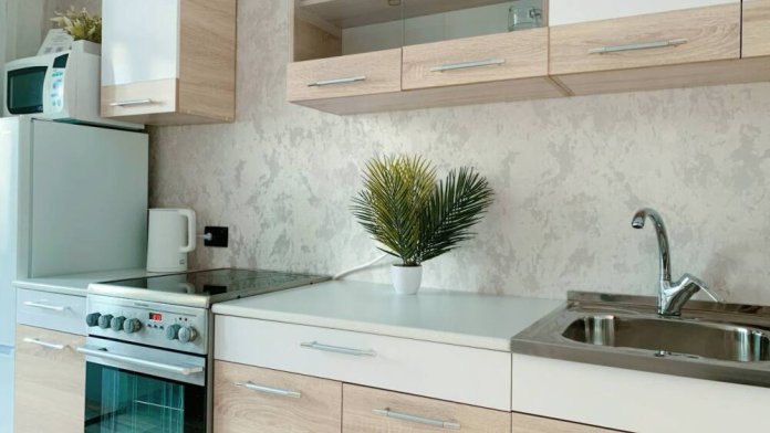 - Кухня с холодильником, плитой, микроволновой печью, электрическим чайником и посудой.