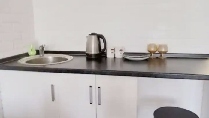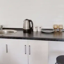 - кухня с холодильником, плитой, микроволновой печью, электрическим чайником и посудой.