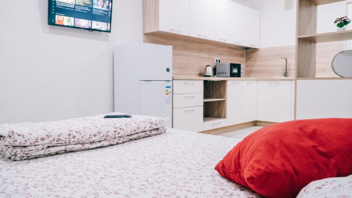 - кухня с холодильником, плитой, микроволновой печью, электрическим чайником и посудой.