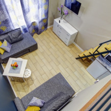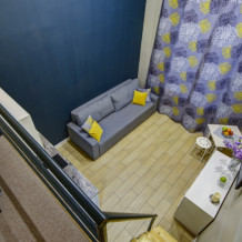 Двухспальная кровать 160*200 на втором ярусе. В маленькой гостиной зоне раскладывающаяся софа (внутри Вы найдете подушку, одеяло и постельное белье)