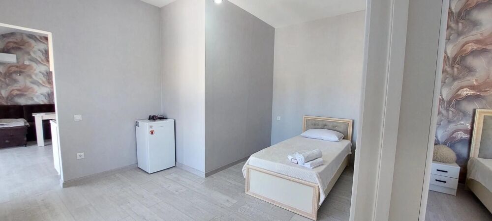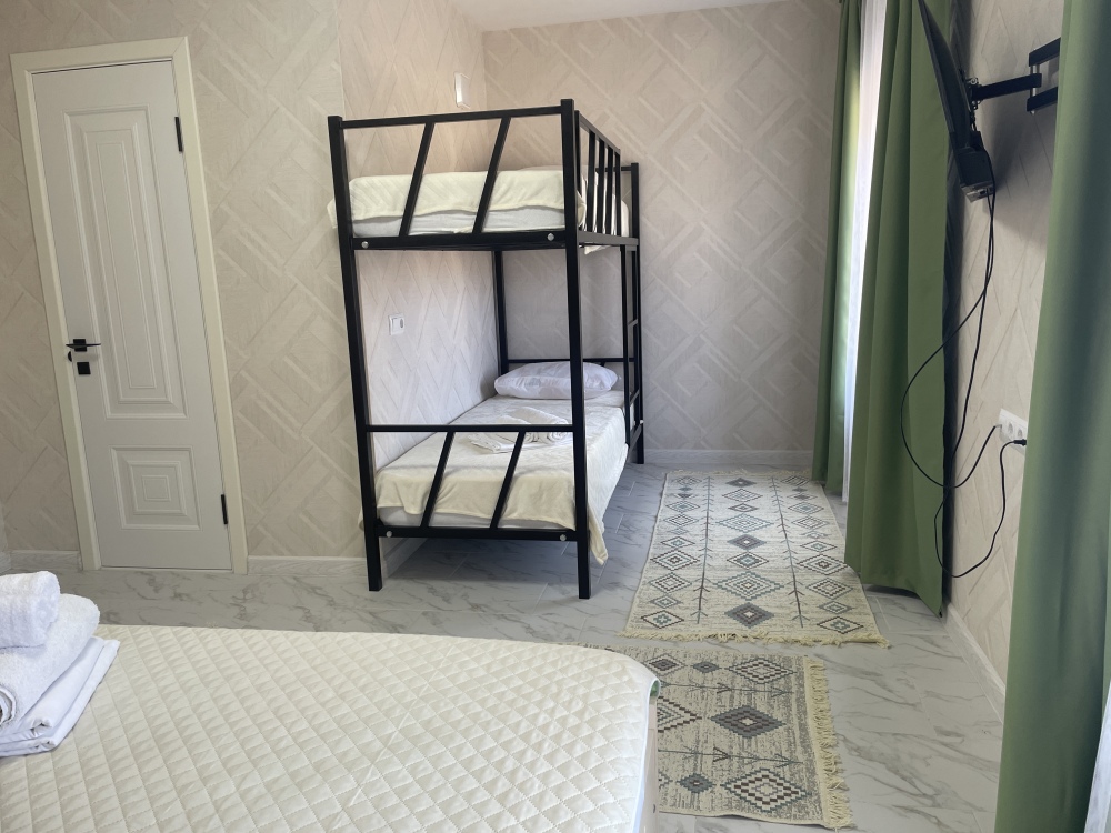 Трехместный номер со своим санузлом. В номере имеется одна односпальная кровать и одна двуспальная кровать(трансформер), которую можно разделить в две односпальные. Этот номер идеально подходит для отдыха семьи с одним ребенком, компании из трех друзей или взрослых с пожилым родственником, которым важно иметь раздельные спальные места, постельное белье и набор полотенец.