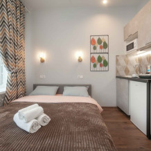 Студия оборудована всем, что нужно для Вашего отдыха: телевизор,чистое постельное белье из прачечной, оборудованная кухня, гладильные принадлежности, фен, стиральная машина, бесплатный Wi-Fi. Вам не придется срочно бежать в магазин за кружками или полотенцем – мы уже позаботились обо всем.