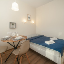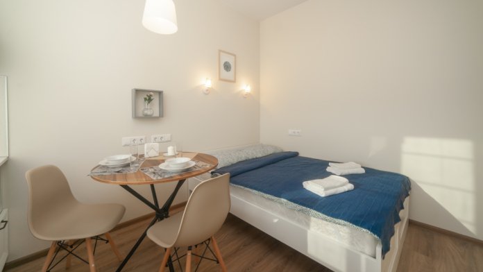 Студия оборудована всем, что нужно для Вашего отдыха: телевизор, постельное белье, средства гигиены, оборудованная кухня, гладильные принадлежности, фен, стиральная машина, бесплатный Wi-Fi. Вам не придется срочно бежать в магазин за кружками или полотенцем – мы уже позаботились обо всем.