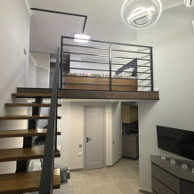 Тихая квартира в центре города. Высота потолка 5 метров. 2 уровня. Отдельный вход, не через общий подъезд. Возможность подъехать прямо ко входу (остановиться и выйти из такси чтобы не было лишних глаз).