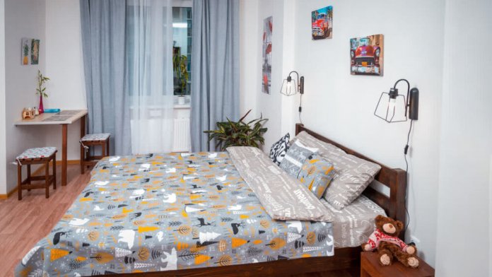 Весь интерьер выполнен в светлых, спокойных тонах. Текстиль, который используется в студии преимущественно из хлопка. Мебель из хвойных пород дерева. Всегда в наличии минеральная чистая вода. Большая двуспальная кровать с ортопедическим матрасом. Оборудование для ионизации, озонирование и очищение воздуха. Есть кухонный блок для приготовления пищи. Есть вся необходимая техника и предметы обихода. Смарт ТВ и высокоскоростной Wi-Fi.