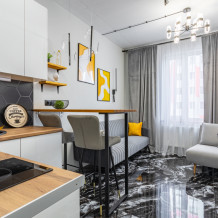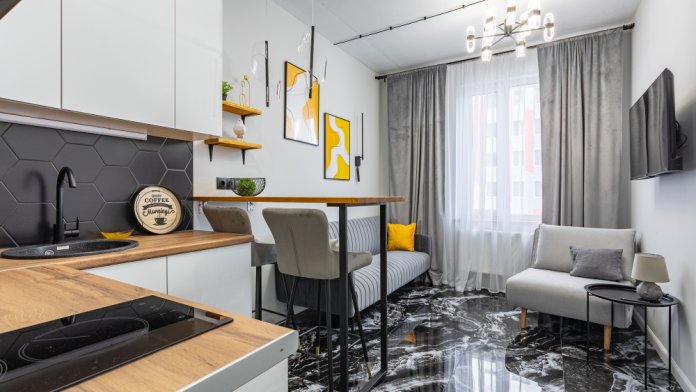 Оснащение квартиры: телевизор, кухонная зона, холодильник, электрический чайник, микроволновая печь, фен, стиральная машина.