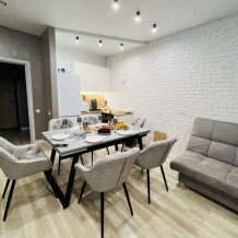 Уютная гостиная с полностью оборудованной кухней и большим обеденным столом, две комфортабельные спальни сделают Ваше пребывание незабываемым. В ближайшей перспективе установка элементов детской площадки и беседки на мангальной зоне.