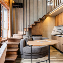 Кухня - гостиная оборудована всей необходимой посудой и техникой, кухонный диван, кофеварка, приготовление коктейлей;