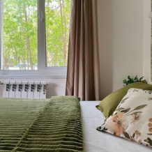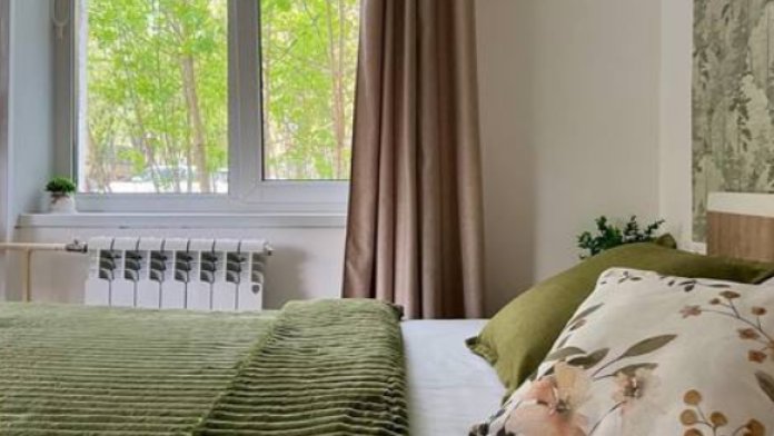 Уютная студия для одного гостя, в которой есть все необходимое для комфортного проживания: полутороспальная кровать, телевизор, холодильник, стиральная машина, микроволновая печь, электроплитка, фен и многое другое.