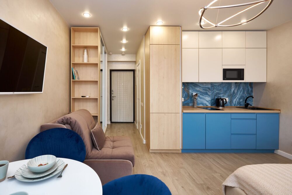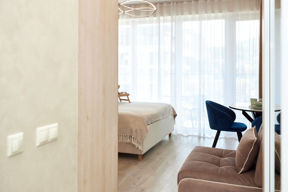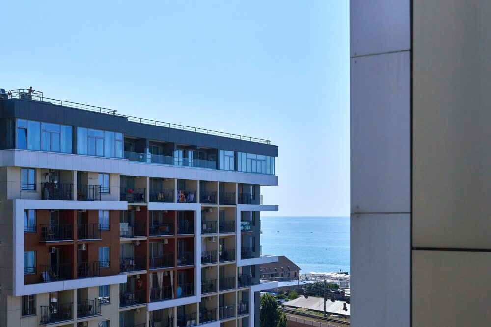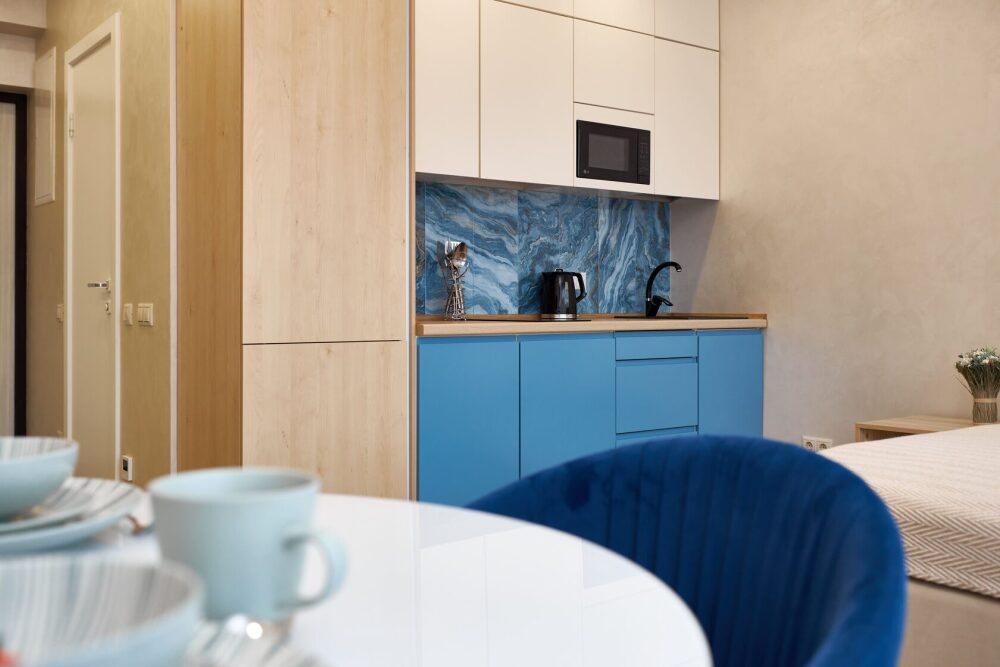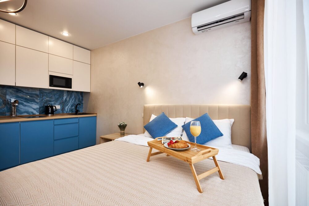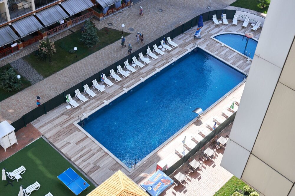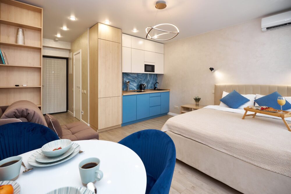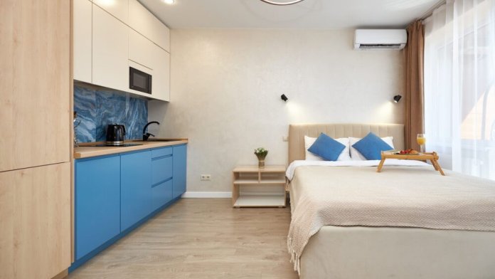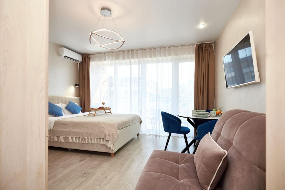 Просторная и очень красивая студия «Вlu lagoon» c дизайнерским ремонтом, с видом на бассейн и боковым нa мopе и горы.