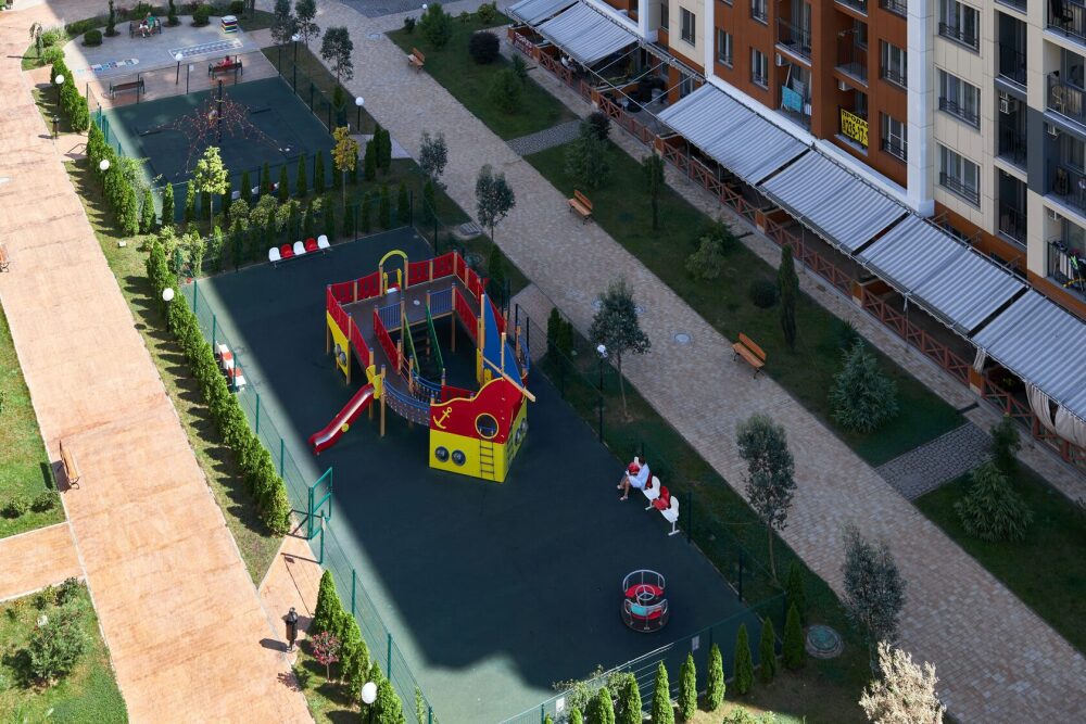 В комплексе есть бассейн с подогревом (платный, работает с мая по октябрь), для детей и взрослых, закрытая придомовая территория, детские и спортивные площадки, детский клуб, кофейня.