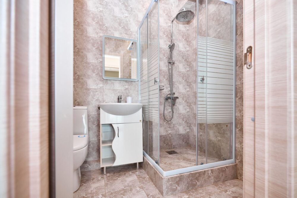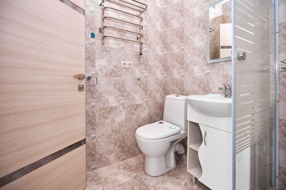 Санузел оснащен раковиной с зеркалом, душевой кабиной, унитазом, полотенцесушителем.