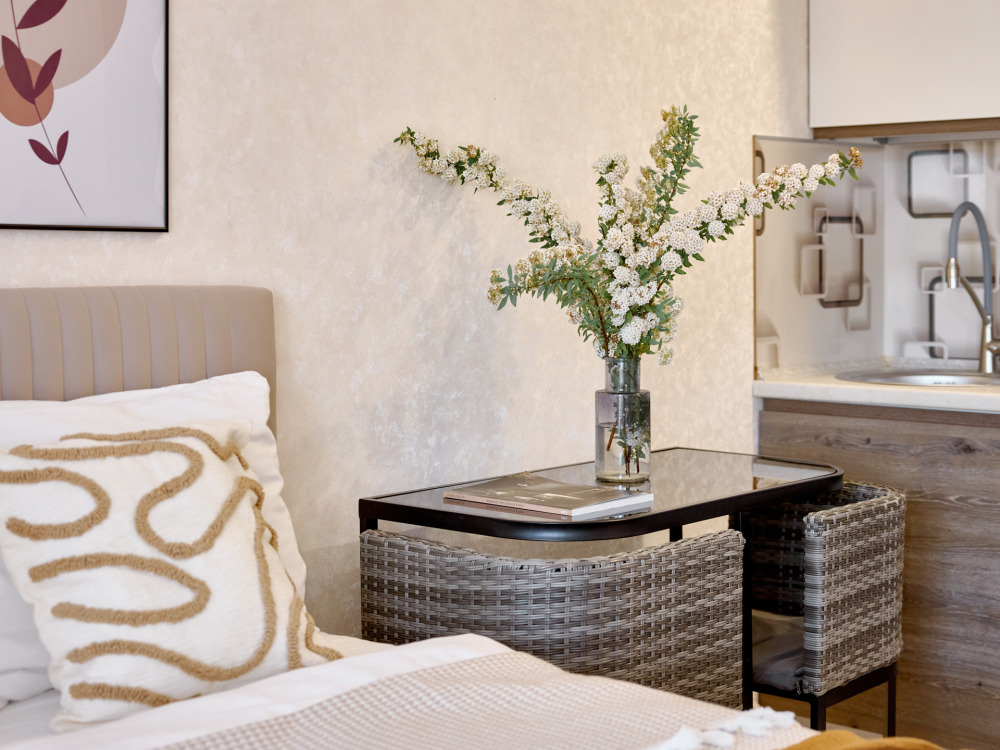 Видовые апартаменты-студия «Chocolate Studio» c евроремонтом, с видом на бассейн и боковым видом на море и горы. В квартире имеется всё необходимое для комфортного проживания семьи из 2-3 человек. Гостям предоставляется доп.место по запросу, телевизор c плocким экpаном, Smаrt Тv и кaбельными канaлами, Wi-Fi, кондиционер, балкон с мебелью. Имеется кухонная зона со всеми принадлежностями. Чайник, микроволновая печь, столовые приборы и посуда, варочная поверхность для самостоятельного приготовления еды, стол и стулья. Санузел оснащен раковиной с зеркалом, душевой кабиной, полотенцесушителем, унитазом и стиральной машиной.