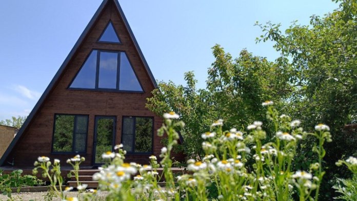 Двухэтажный треугольный дом (афрейм) с мансардой с потрясающим видом на Бештау и подогреваемым круглогодичным бассейном. Бассейн теплый 32-34 градуса, круглый 366*122.