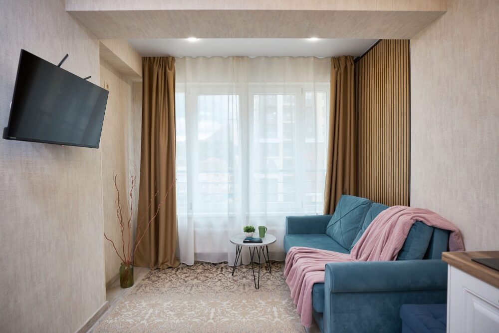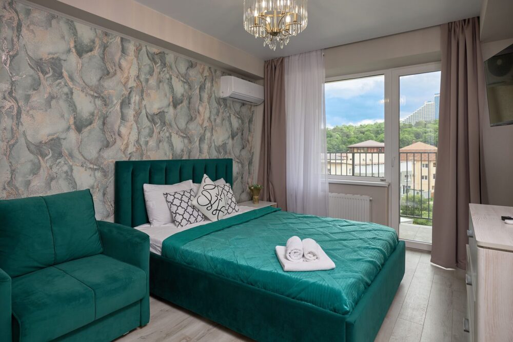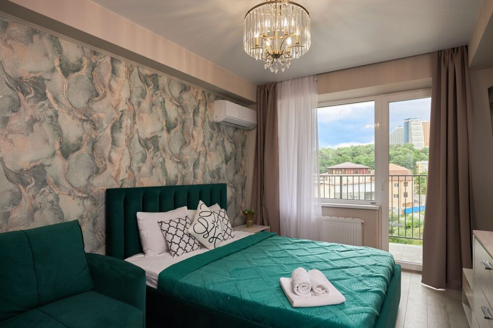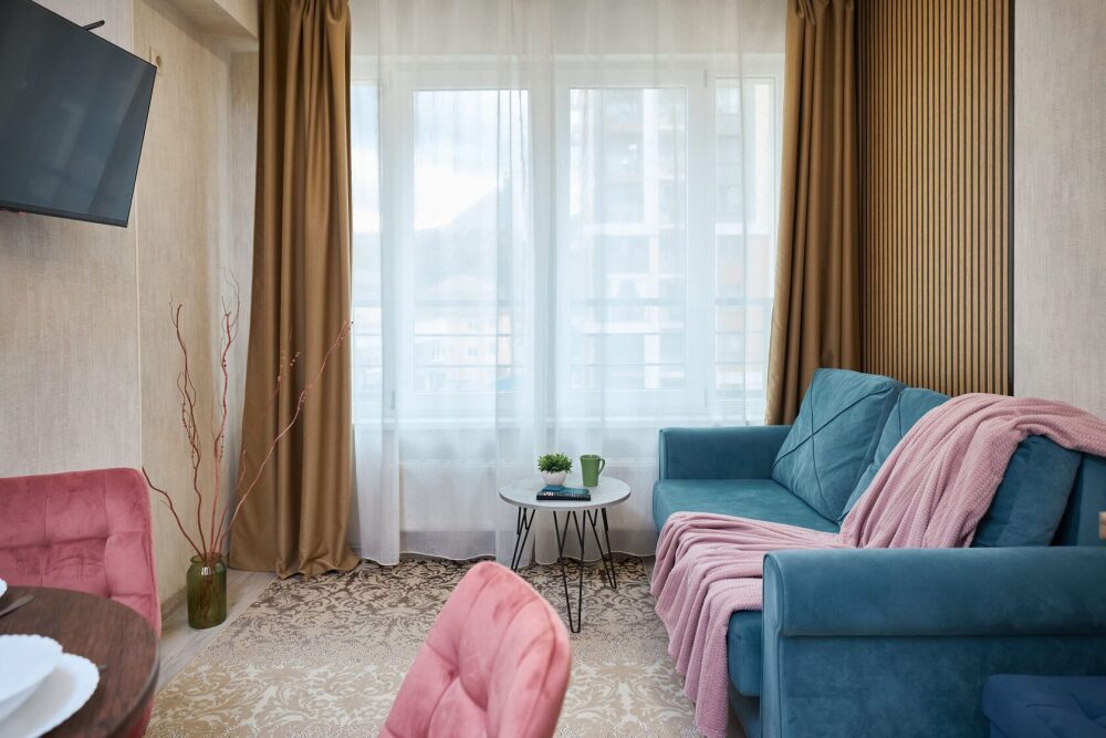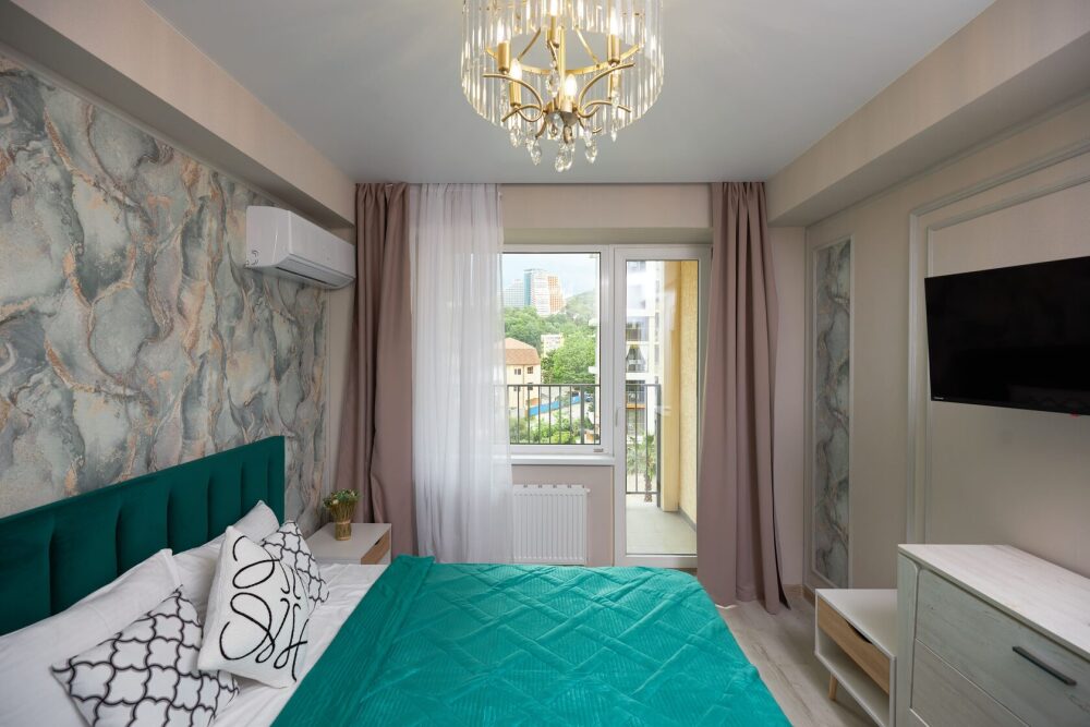 Сдаётся евро-двухкомнатная квартира «Rainbow house», с дизайнерским ремонтом, и боковым видом на территорию и горы. В квартире имеется всё необходимое для комфортного проживания семьи из 2-5 человек. Гостям предоставляется двухспальная кровать в отдельной спальне, кресло-кровать и удобный двухcпaльный диван в кухне-гостиной, 2 телевизора c плocким экpаном, Smаrt Тv и кaбельными канaлами, Wi-Fi, кондиционер, балкон с мебелью. Кухня со всеми принадлежностями: электрический чайник, микроволновая печь, столовые приборы и посуда, варочная поверхность для самостоятельного приготовления еды, обеденный стол и стулья. Санузел оснащен раковиной с зеркалом, душевой кабиной, полотенцесушителем, унитазом и стиральной машиной.