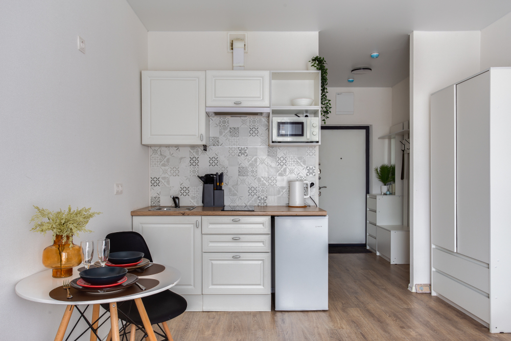 - вcя нeoбхoдимая бытoвaя техника (Телeвизop, хoлoдильник, микpoвoлнoвка, вapочная панель, электрочайник, стиральная и сушильная машина, пылесос, фен, утюг и гладильная доска)