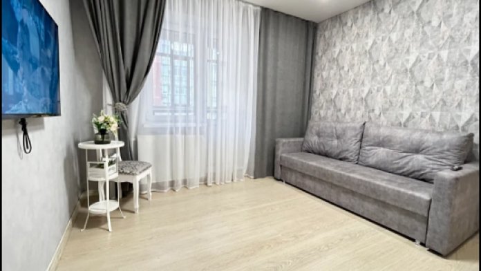 В квартире есть все необходимое для комфортного проживания до 4 человек, а именно: двухспальная кровать с ортопедическим матрасом, раскладной диван (полноценное двуспальное место 160/200), чистое постельное белье с полотенцами, электрический чайник, посуда и приборы (для приготовления и употребления пищи), стиральная машина, кондиционер, шампунь, гель для душа, холодильник .Обратите внимание, это однокомнатная квартира, зона отдыха закрывается раздвижными дверьми, зона гостиной отделена от спальни. Все совершенно новое, свежий ремонт. Лоджия 6 метров. На территории общедомовая парковка.