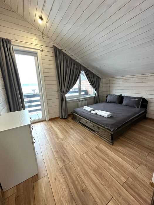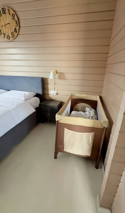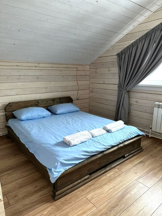 Домик рассчитан на 2 взрослых и ребёнок (можно с двумя детьми, если один ребёнок будет спать с родителями на кровати, для второго предоставим раскладушку).
