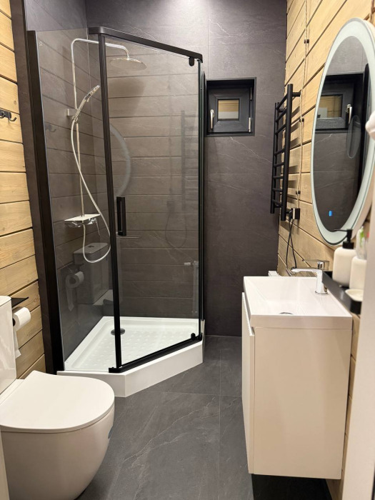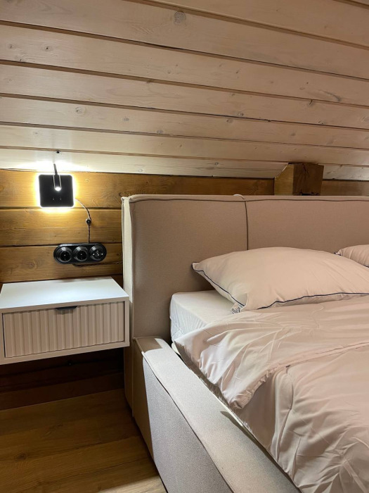 Это наш новый дом, в одной из спален есть домашний кинотеатр, wi-fi, вся необходимая посуда и даже мультиварка Bork.