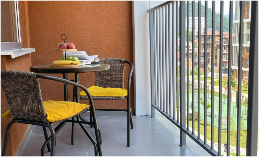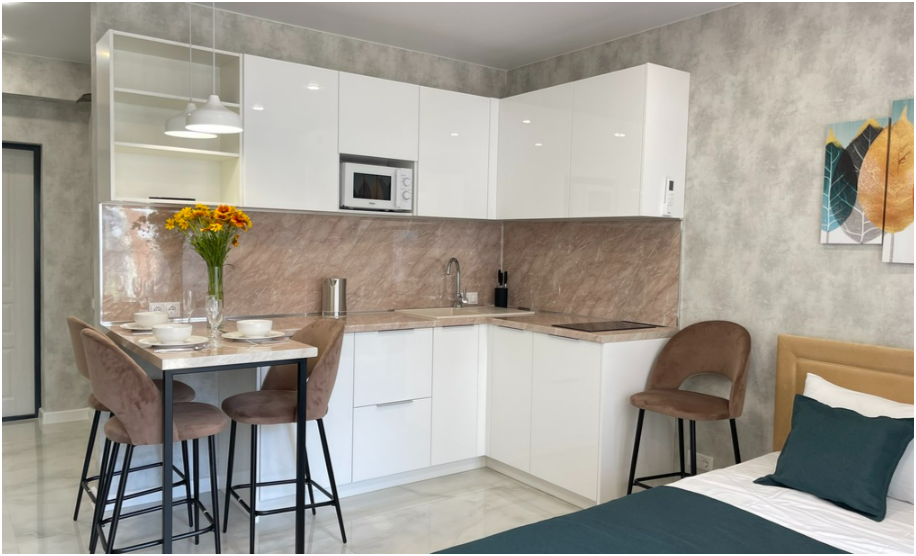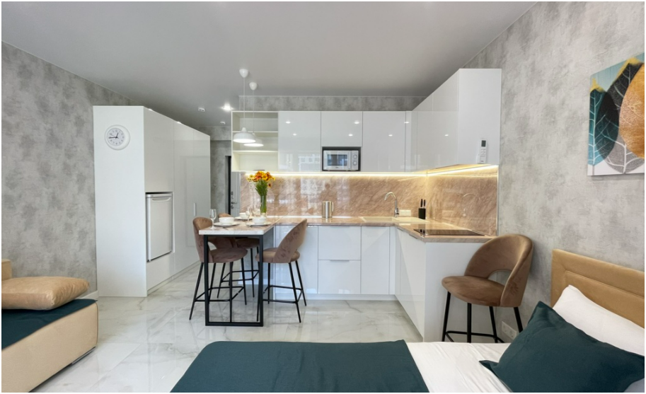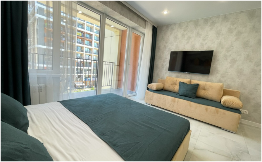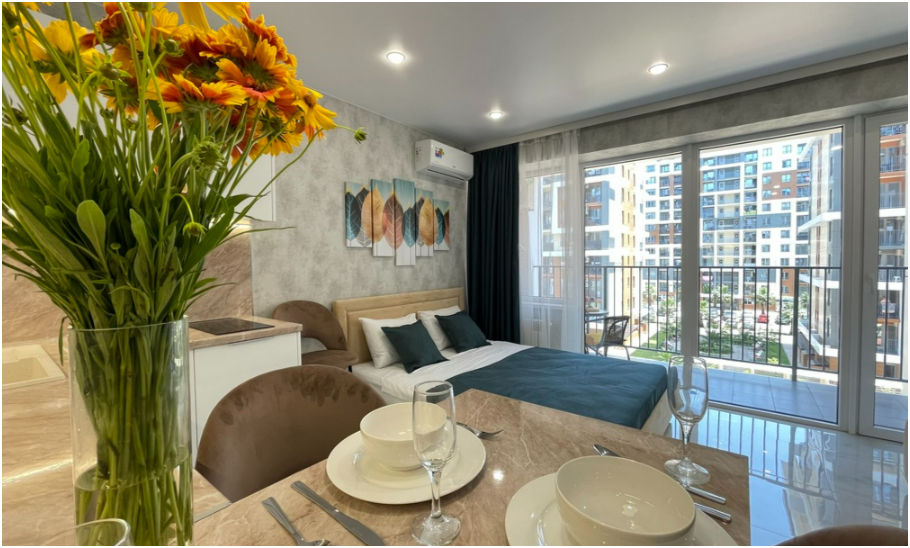 Сдаются уютные апартаменты-студия «Blue & White» c новым ремонтом, с видом на бассейн и боковым видом на море и горы. В квартире имеется всё необходимое для комфортного проживания семьи из 2-4 человек. Гостям предоставляется удoбная двухспальная кровать, кресло-кровать и доп. меcтo по запросу, телевизор c плocким экpаном, Smаrt Тv и кaбельными канaлами, Wi-Fi, кондиционер, балкон с обеденной зоной, фен, утюг, сушилка, постельное белье и полотенца. Имеется кухонная зона со всеми принадлежностями. Чайник, микроволновая печь, столовые приборы и посуда, варочная поверхность для самостоятельного приготовления еды, стол и стулья. Санузел оснащен раковиной с зеркалом, душевой кабиной, полотенцесушителем, унитазом и стиральной машиной.
