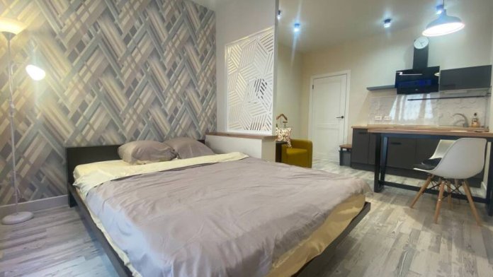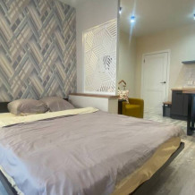 В спальной зоне - большая двуспальная кровать, 3-й гость может с комфортом разместится на удобном кресле-трансформере. Для размещения вещей есть вешалка, обувница.