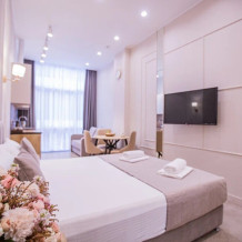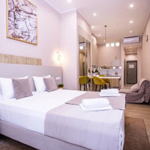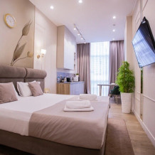 Однокомнатные апартаменты делюкс с роскошным интерьером. Дизайн выполнен в теплых тонах, располагающих к отдыху. Апартаменты оснащены собственной ванной комнатой, кухней и зоной отдыха. Окна выходят на тихую сторону улицы - что позволит Вам уединиться от шума городской суеты.