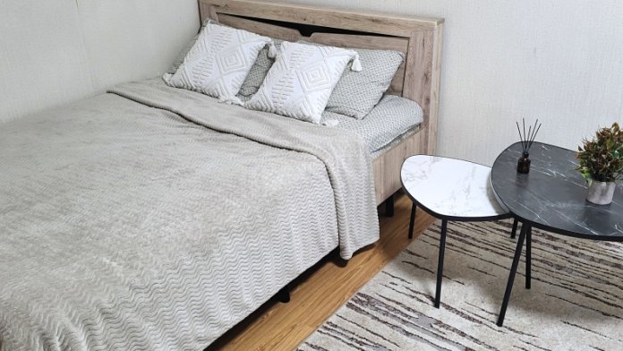 Квартира укомплектована для длительного проживания: кухня , стол, стулья, посуда для приготовления и приема пищи, микроволновая печь, газовая печь, холодильник; двуспальная кровать с удобным матрасом, раскладной диван 140х200 см, телевизор с 220 каналами, шкаф с большим количеством места для хранения вещей; ванная , стиральная машина, горячая вода есть всегда.