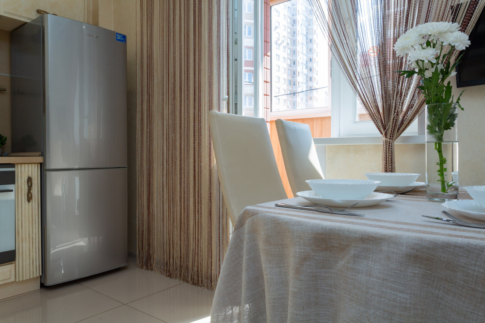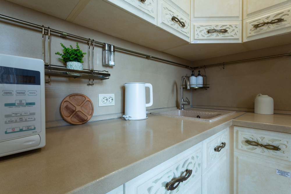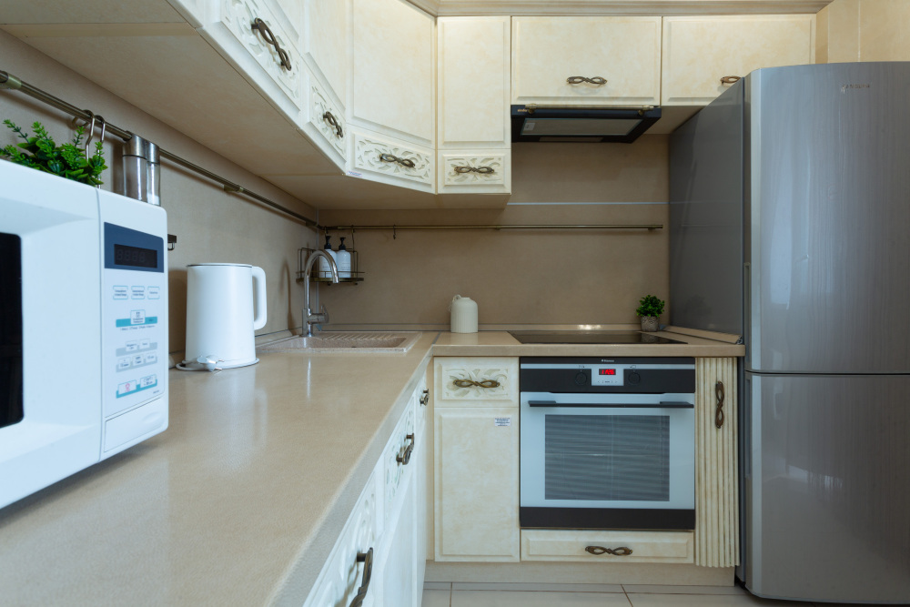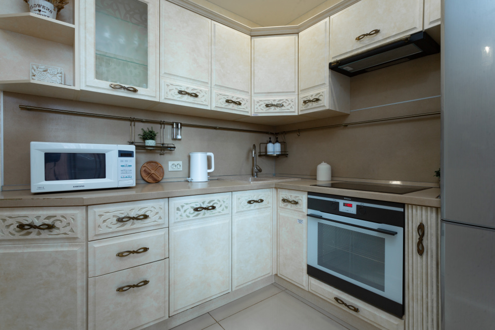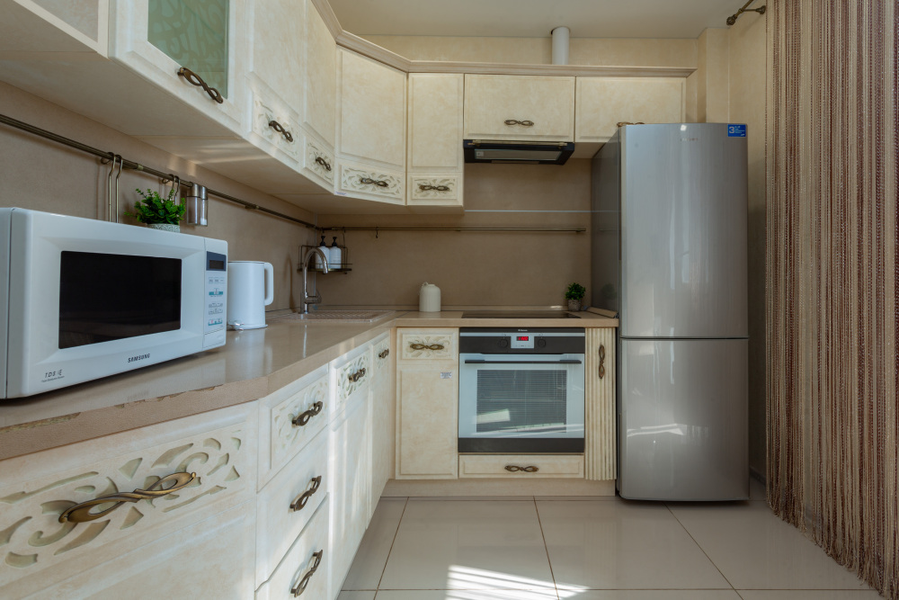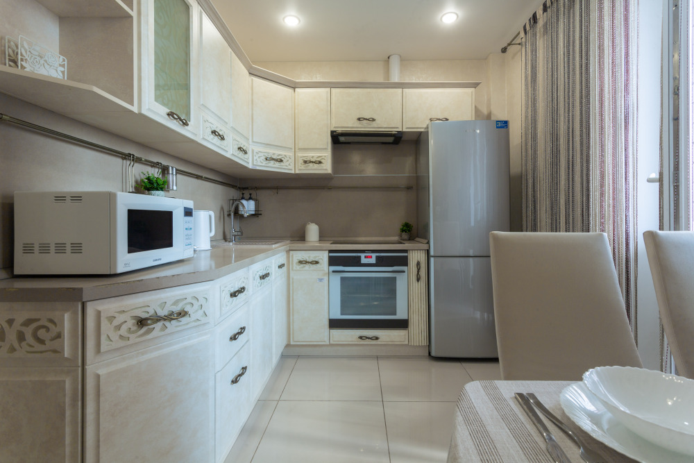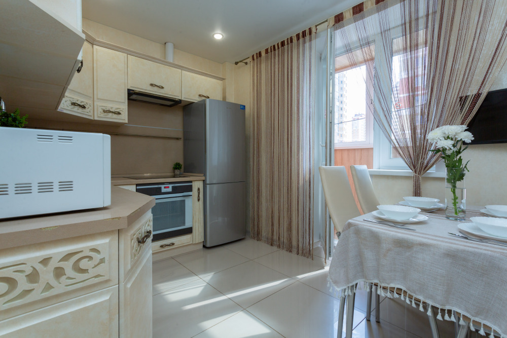 • Кухня: холодильник, плита, духовка, микроволновка, чайник, вся необходимая посуда