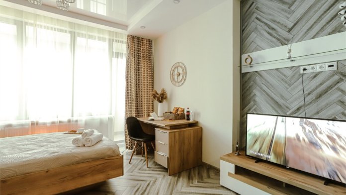 - Просторная кровать с удобным матрасом, постельным бельем из страйп-сатина, где вы почувствуете себя будто в уютном гнездышке. Скоростной Wi-Fi и современное SMART TV.
