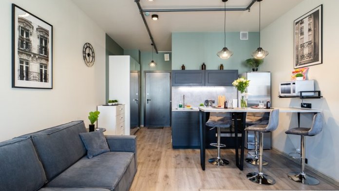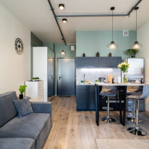 - Стильная кухня в полной комплектации. Мини-бар позволит вкусно перекусить в перерыве между делами.