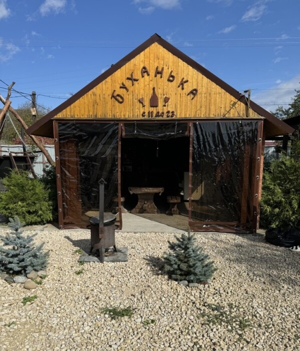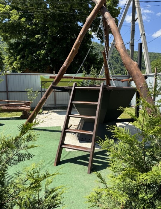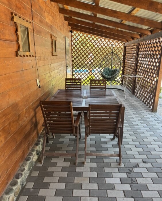 На территории имеется: детская площадка, баня, большая беседка с дубовой мебелью и камином, летний бассейн.