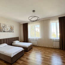 Описание: двуспальная кровать, две тумбочки прикроватные, 1 стул, стол, кондиционер телевизор, холодильник, электрический чайник, столовые приборы, сан узел в номере, фен, халат, набор полотенец.