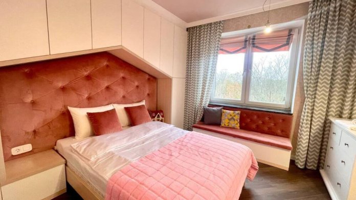 Двухкомнатная квартира с дизайнерским ремонтом. Площадь 84.5 кв. метров. 6 этаж. Вид из окна на парк и озеро. Закрытая территория дома с парковкой для машин.
