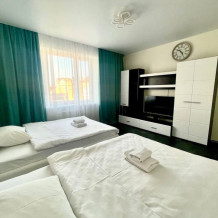 Сама квартира имеет удобную планировку: две изолированные комнаты, отдельная кухня и совмещенный санузел. Спальня оснащена двумя раздельными полуторными кроватями (150х200), а в гостиной двуспальный раскладной диван (160х200). Плюс есть возможность использовать еврораскладушку. Это позволяет разместить до 5-ти человек. Есть две застекленные лоджии с видом во двор с выходом из гостиной.