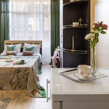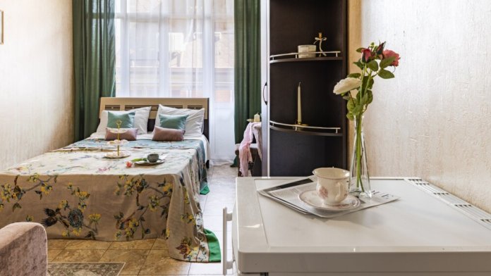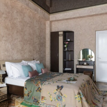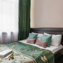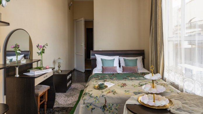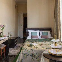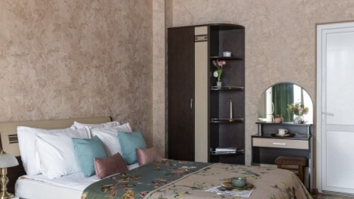 Просторный однокомнатный номер с двуспальной кроватью и ванной комнатой. В номере имеется: диван раскладной двуспальный, две прикроватные тумбочки, платяной шкаф/вешалка, телевизор, холодильник, журнальный столик, туалетный столик с зеркалом, кондиционер.