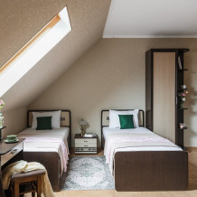 Светлый, просторный номер и ванной комнатой. Номер оснащен: двуспальная кровать и три кровати-полуторки или двуспальная кровать, две кровати-полуторки и раскладывающееся кресло, прикроватные тумбочки, шкаф-вешалка, журнальный стол, зеркало, холодильник, кондиционер, телевизор.Wi-Fi. Ванная комната: санузел, душевая кабина, раковина, зеркало.