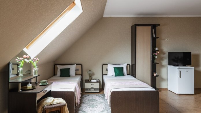 Номер оснащен: двуспальная кровать и две кровати-полуторки, прикроватные тумбочки, шкаф-вешалка, журнальный стол, зеркало, холодильник, кондиционер, телевизор. Wi-Fi.