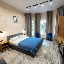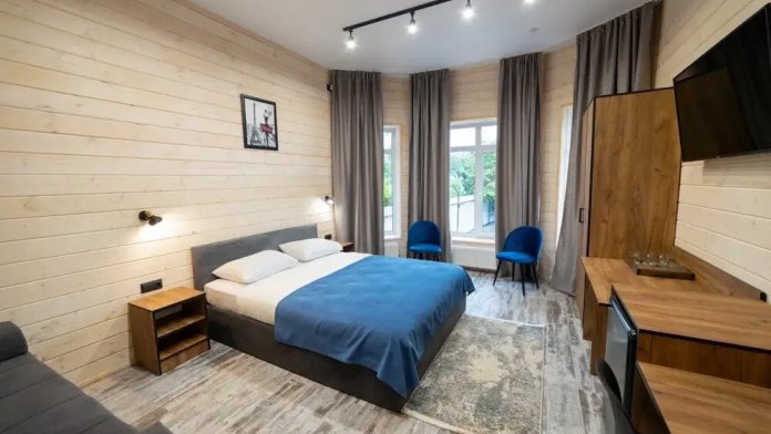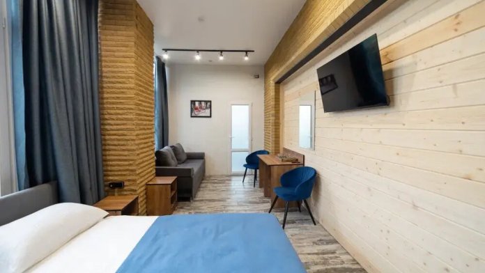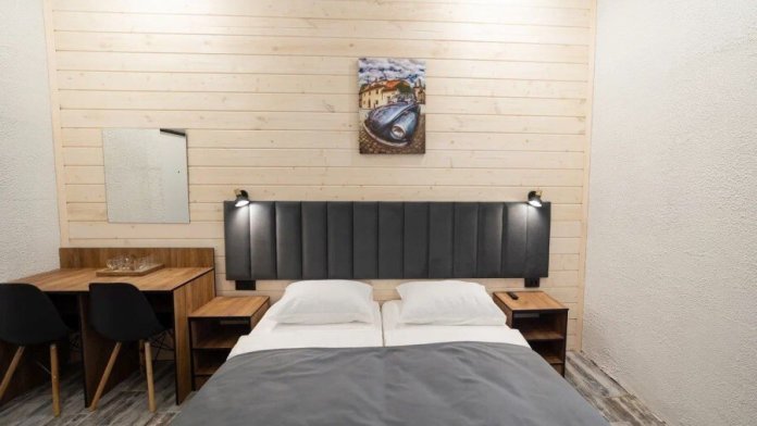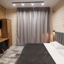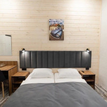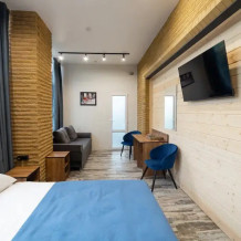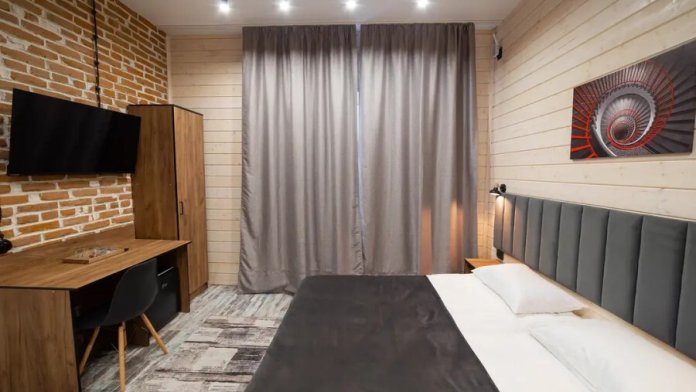 Номер замечательный: просторная удобная кровать, большой телевизор, вместительный холодильник, много открытых полок для вещей, а также стол и стулья. Интерьер в стиле лофт, и поддерживается идеальная чистота. Особенно хочется отметить приветливый и внимательный персонал, который охотно отвечал на все наши вопросы, помог настроить телевизор и порекомендовал отличные заведения с вкусной кухней!