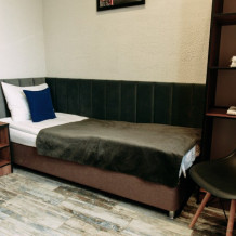 Однокомнатный номер категории «Полулюкс трехместный» в лофт стиле с возможностью размещения дополнительного места. В номере: 2 односпальные кровати, доп.место кресло-кровать, шкаф, стол, стулья кондиционер, белое постельное белье страйп сатин, полотенца на каждого гостя, тапочки, фен и косметические средства.