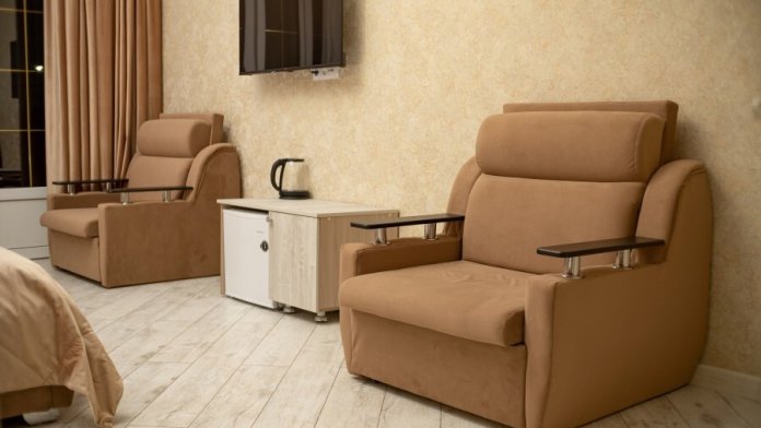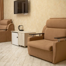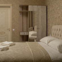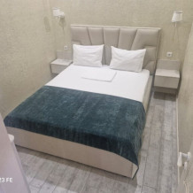 Двухместный номер с двуспальной кроватью и дополнительным спальным местом (кресло-кровать). Номер оснащён телевизором, холодильником, феном, современным санузлом. В ванной комнате личные принадлежности - тапочки, халат, полотенца, шампуни.