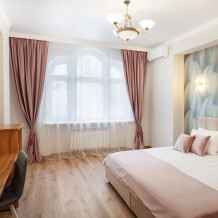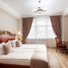 Центром номера является большая и красивая кровать king size с высоким изголовьем, которая обеспечит комфортный сон и отдых после насыщенного дня. Рядом с кроватью находится элегантный туалетный столик с зеркалом, где Вы сможете привести себя в порядок и насладиться уединением.