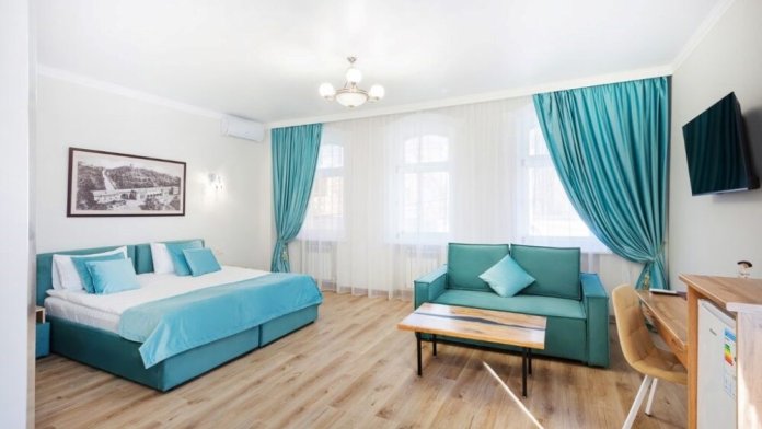 Благодаря большим окнам, номер всегда наполнен естественным светом, создавая ощущение простора и воздушности. Гостиная оборудована мягким диваном, где гости могут насладиться чашкой ароматного кофе или чая.